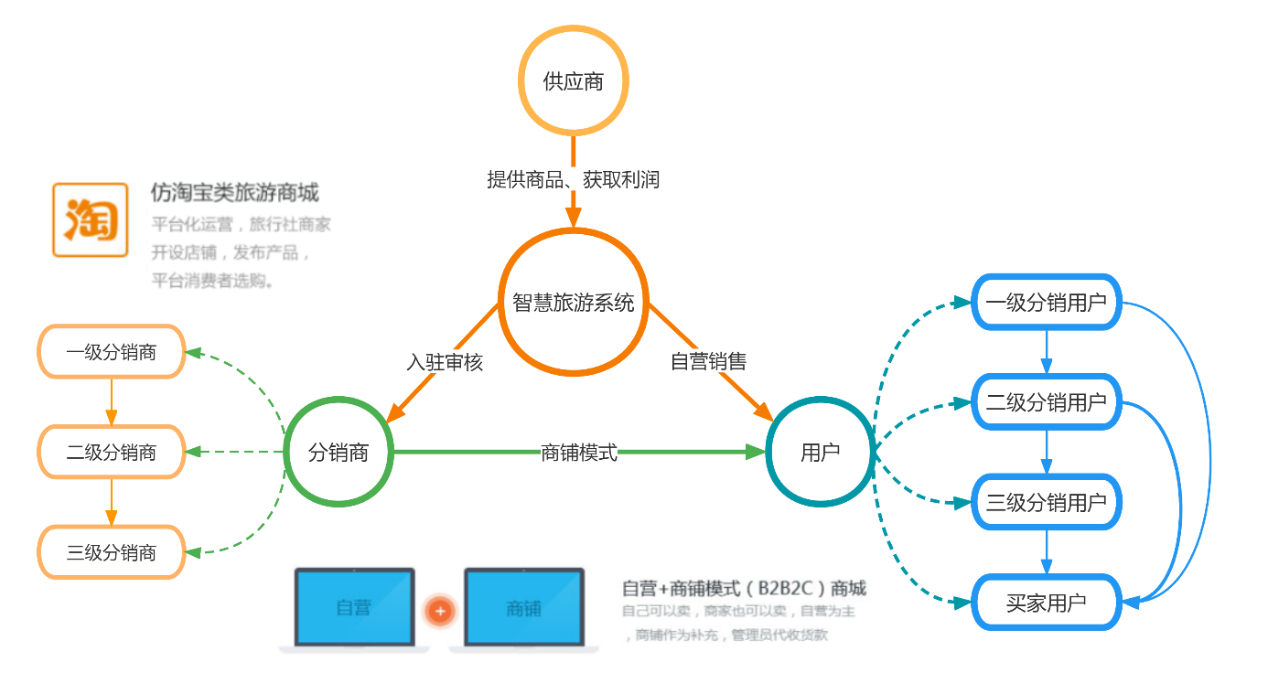 該架構體系改革了傳統旅游的發展模式,智慧旅游系統是旅游業專屬的同業采購與分銷業務平臺標準化產品,供應商入駐模式,商家獨立管理中心以及平臺傭金結算、售后服務系統等更完善的詮釋了旅游電子商務在現今及未來的發展模式。支持多供應商店鋪經營模式,讓旅行社企業、旅游聯盟團體、旅游門戶網站等開展平臺類型電商業務更加便捷。旅游業專屬的同業采購與分銷業務各項功能從根源上解決了旅游電子商務企業普遍存在的推廣、招商、盈利等問題。供應商、分銷商與平臺共存模式,極大的豐富了平臺產品,是旅游企業開展平臺類型旅游電商業務的最佳選擇。